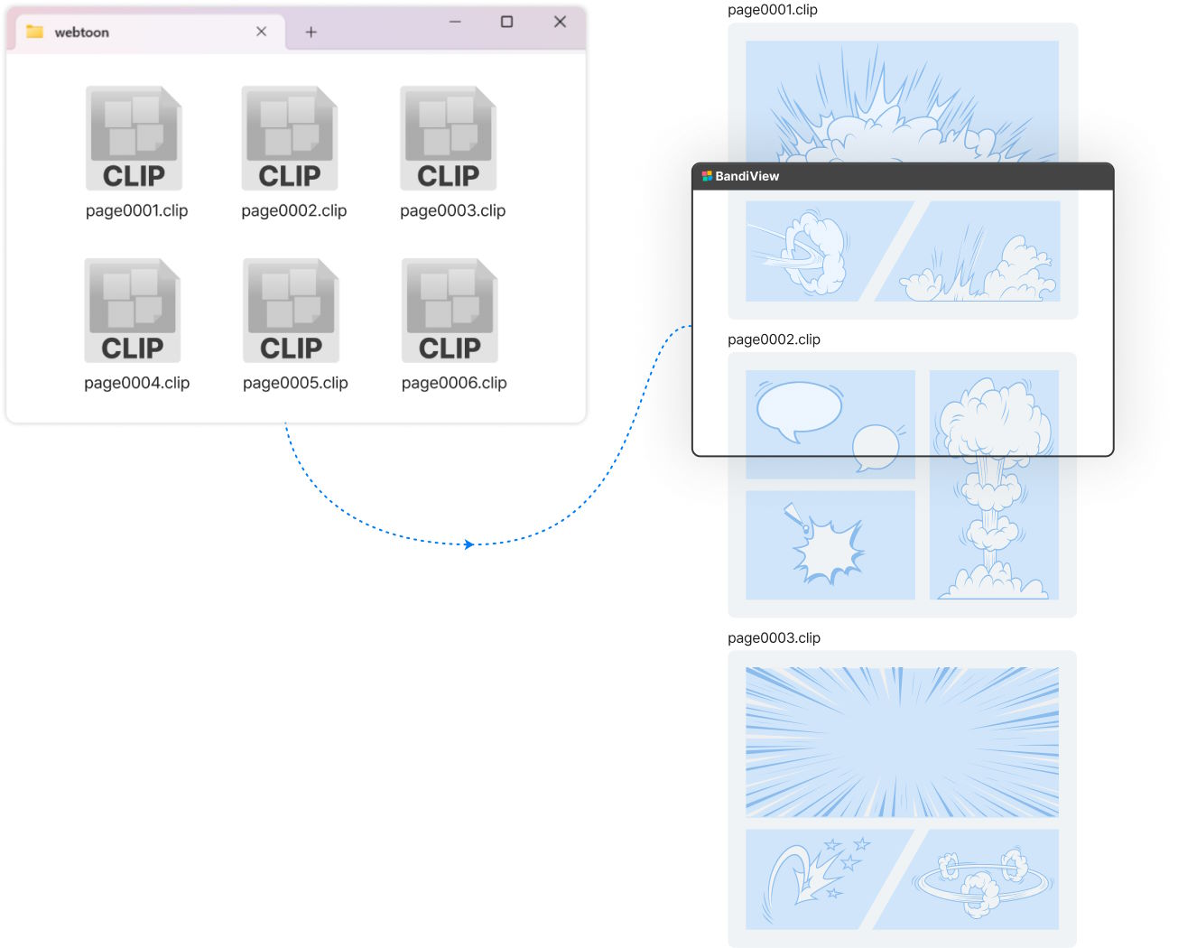 Modul de vizualizare Webtoon permite vizualizarea tuturor fișierelor de imagine dintr-un dosar într-un flux vertical, similar vizualizării webtoon în browserul web. De asemenea, este și convenabil să puteți vizualiza imediat fișierele Photoshop (PSD, PSB) sau fișierele CLIP STUDIO PAINT (CLIP) la care lucrați încă, fără a fi nevoie să le convertiți în fișiere în formate generale, cum ar fi PNG.
